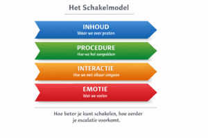 Een model dat hier veel inzicht in geeft is het schakelmodel. Dit model laat zien dat gesprekken zich op verschillende niveaus afspelen: inhoud, procedure, interactie en emotie. Hoe beter je kunt schakelen tussen die niveaus, hoe eerder je escalatie kunt voorkomen. Maar daarvoor moet je eerst horen wat er echt gezegd wordt. Want achter boosheid zit vaak een boodschap. En als je die boodschap kunt benoemen, kan het gesprek kantelen.
